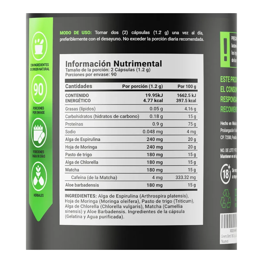 Greens Blend de B life combina superalimentos verdes como espirulina, chlorella, pasto de trigo y alfalfa en una fórmula práctica y concentrada. Ideal para complementar tu dieta, aumentar tu energía y apoyar la desintoxicación natural del cuerpo.