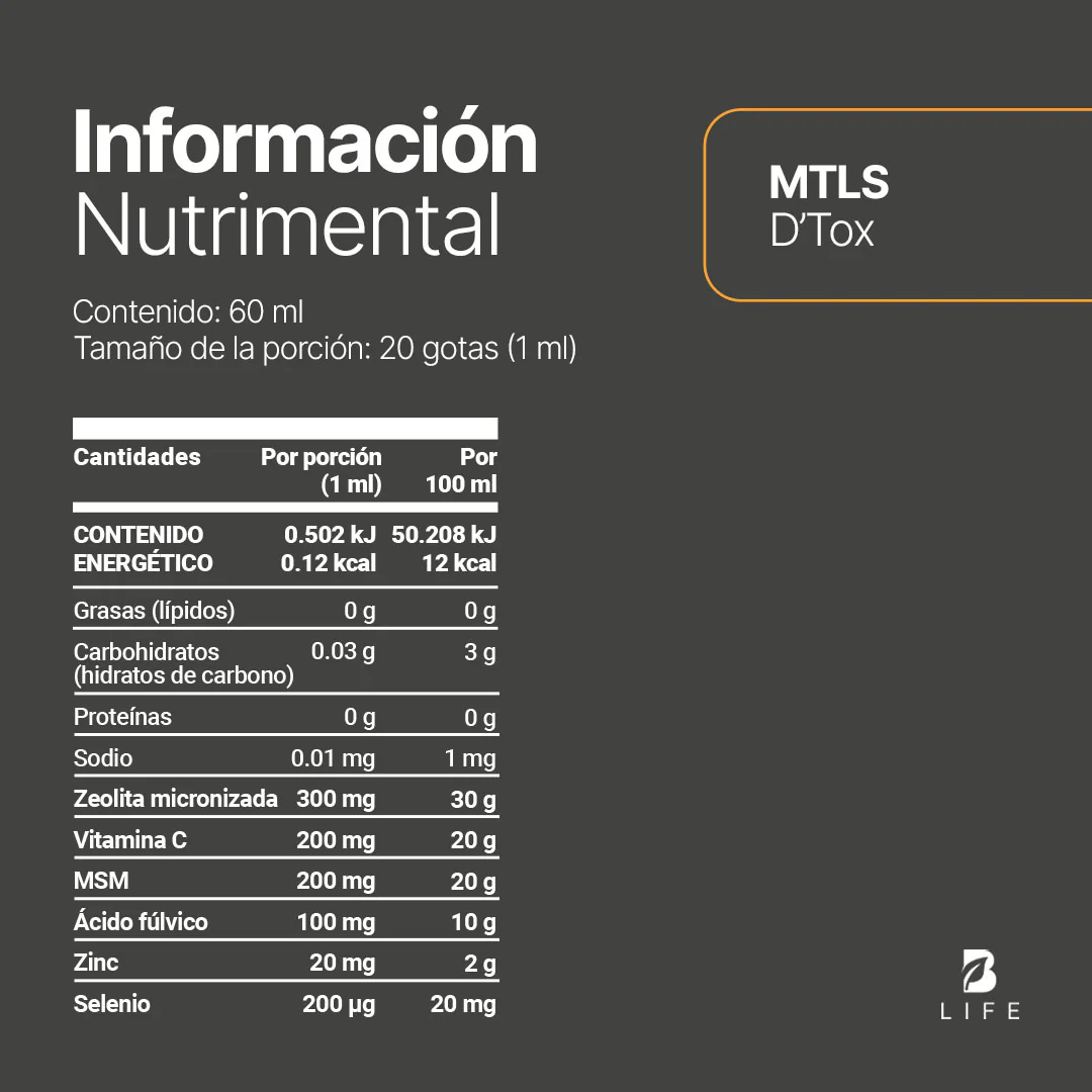 MTLS D’tox de B Life es una mezcla única con zeolita, vitamina C y minerales que ayuda a eliminar metales pesados y toxinas del cuerpo, fortaleciendo al mismo tiempo el sistema inmunológico y promoviendo el equilibrio general del organismo.