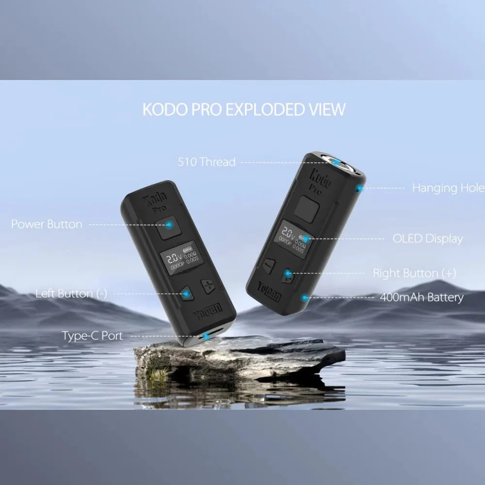 Yocan ha creado una última colección de Baterías Yocan Kodo Pro. Con una pantalla OLED y funciones de contador de bocanadas, precalentamiento, corte de seguridad y ajustes de voltaje. Está equipado con una batería de 400 mAh y puede durar varias sesiones de vapeo. El diseño es inteligente y de bolsillo.