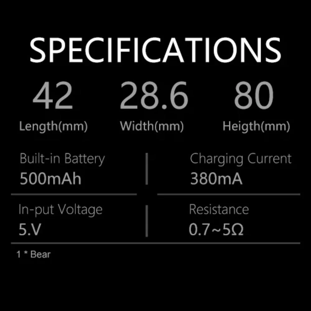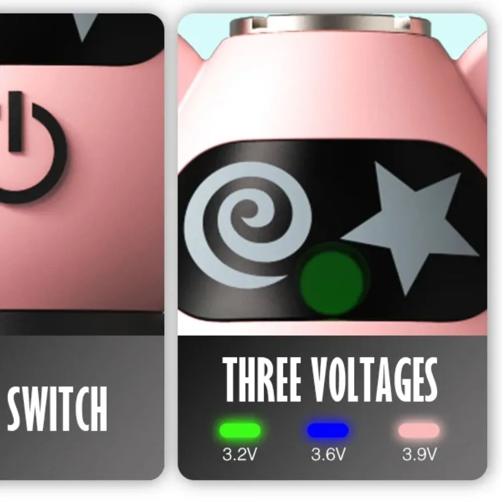 La batería de vaporizador Bear ofrece caladas suaves y satisfactorias con cada uso. Tiene un rango de resistencia de 0,7 a 5 ohmios y tres voltajes preestablecidos, 3,2 V, 3,6 V y 3,9 V. Estos voltajes se muestran a través de un LED en la linda cara del oso, que se ilumina en verde, azul o violeta para mostrar la configuración.
