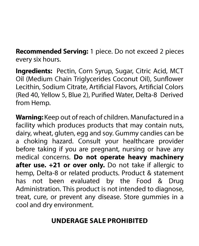 Descripción Es momento de desconectar con delicioso sabor y delta 8 natural con nuestras gomitas a base de pectina. Cada pieza ofrece el potencial de una variedad de sabores de frutas que seguramente satisfarán su gusto por lo dulce, todos con 50 mg de Delta 8 en cada uno. Relájese con un colocón que es fácil de disfrutar y que se deriva del cáñamo cultivado en Estados Unidos con nuestra mezcla surtida de gomitas infundidas Delta 8 hoy. Dosis recomendada: Tomar 1 pieza cada 4 horas. No exceda de 2 piezas cada 6 horas. Concentración 50 mg – Delta 8 por pieza Ingredientes Pectina, jarabe de maíz, azúcar, ácido cítrico, aceite MCT (aceite de coco con triglicéridos de cadena media), lecitina de girasol, citrato de sodio, saborizante artificial, FD&C Blue 2, agua purificada, extracto de cáñamo de espectro completo. Descargo de responsabilidad. ADVERTENCIA: Mantener fuera del alcance de los niños. Las gomitas pueden representar un peligro de asfixia. Consulte a su proveedor de atención médica antes de tomarlo si está embarazada, amamantando o tiene alguna inquietud médica. No opere maquinaria pesada después de su uso. No lo tome si es alérgico al cáñamo, Delta-8 o productos relacionados. El producto y la declaración no han sido evaluados por la Administración de Alimentos y Medicamentos. Este producto no está destinado a diagnosticar, tratar, curar o prevenir ninguna enfermedad. Guarde las gomitas en un ambiente fresco y seco. Prohibida la venta a menores de edad.