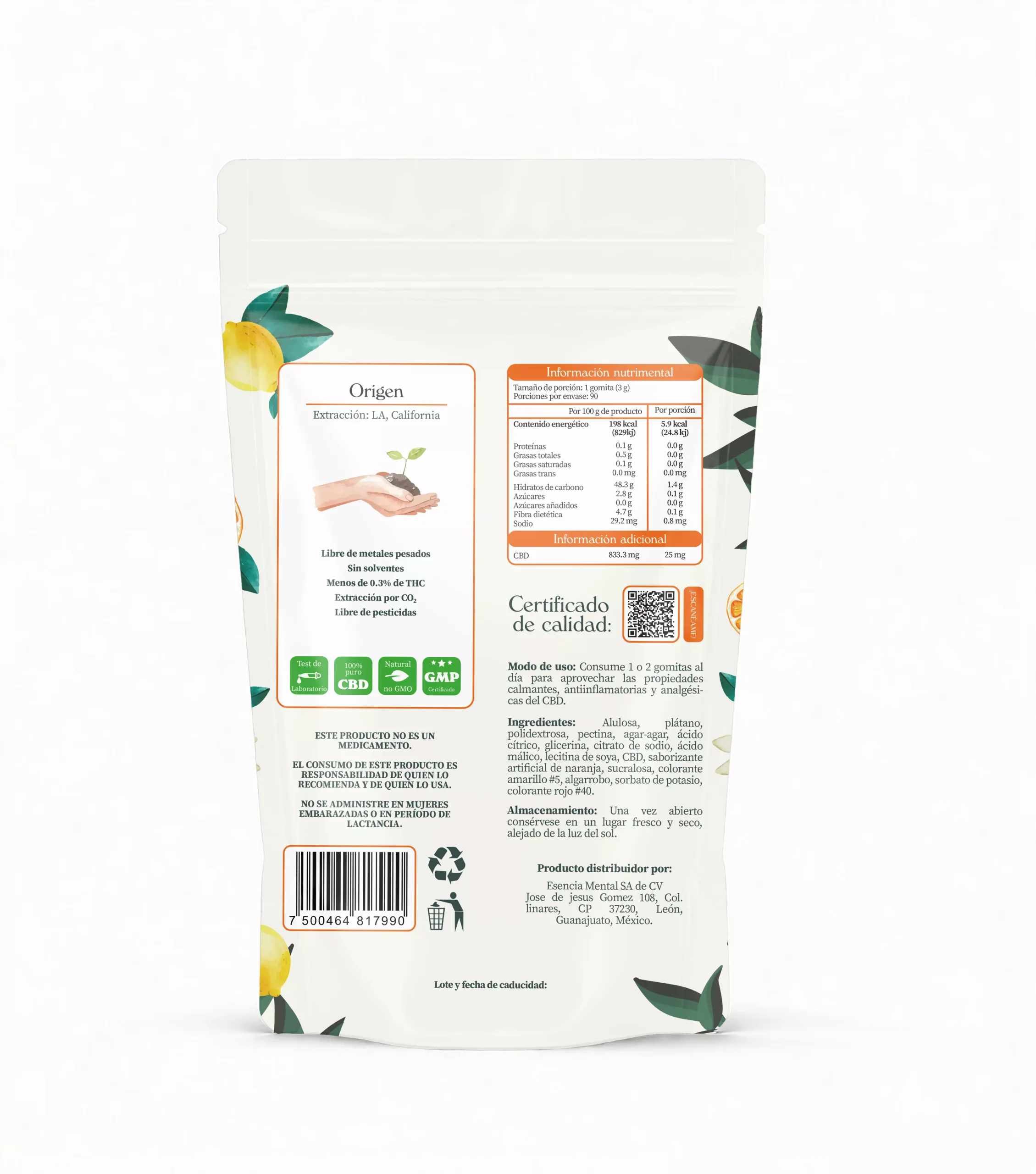 Las gomitas Esencia Mental, contienen extracto de CBD fullspectrum con saborizantes y conservadores naturales. Nos aseguramos de usar los ingredientes de más alta calidad en el mercado.