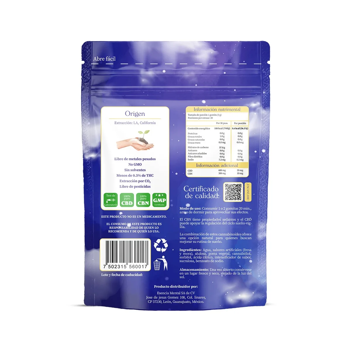 Contenido neto: 30 gomitas.Potencia: 20 mg de CBD + 10 mg de CBN