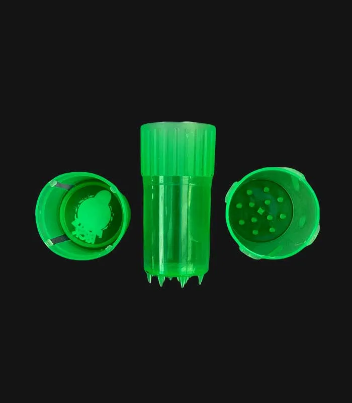 Hecho de plástico resistente, creado para almacenar tus cogollos y al mismo tiempo tienes un grinder integrado, todo en uno :D