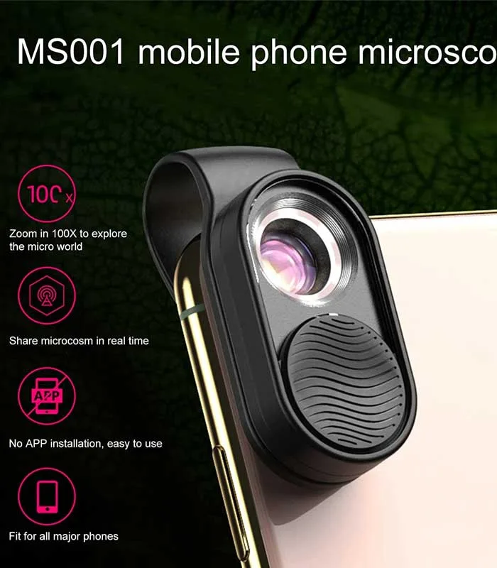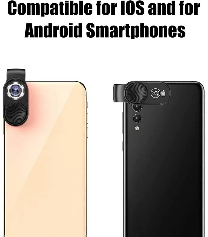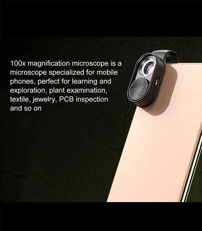 - Microscopio Profesional: ¿Estás buscando un microscopio “móvil” que te permita ver objetos en detalle en cualquier momento y en cualquier lugar? Los microscopios de bolsillo pueden ayudar. Esta es una lente de teléfono que puede convertir su teléfono inteligente en un microscopio profesional. Instale la lente en el teléfono y podrá obtener imágenes instantáneas y grabar en tiempo real con un aumento de 100X. Es una lente muy útil para estudiantes, coleccionistas, ingenieros, probadores y cualqui