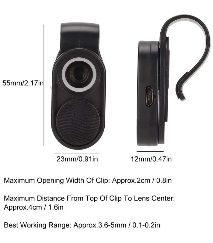 - Amplia aplicabilidad: la distancia máxima desde la parte superior del clip hasta el centro de la lente es de 4 cm/1,6 pulgadas. Y la distancia desde el borde de casi todos los teléfonos hasta el centro de la cámara está en ese rango, lo que hace que este microscopio para teléfono de bolsillo sea adecuado para casi cualquier teléfono inteligente. El clip tiene un ancho máximo de apertura de 2 cm / 0,8 pulgadas para que pueda usarlo con la carcasa de su teléfono. (Si la cámara de su teléfono tiene